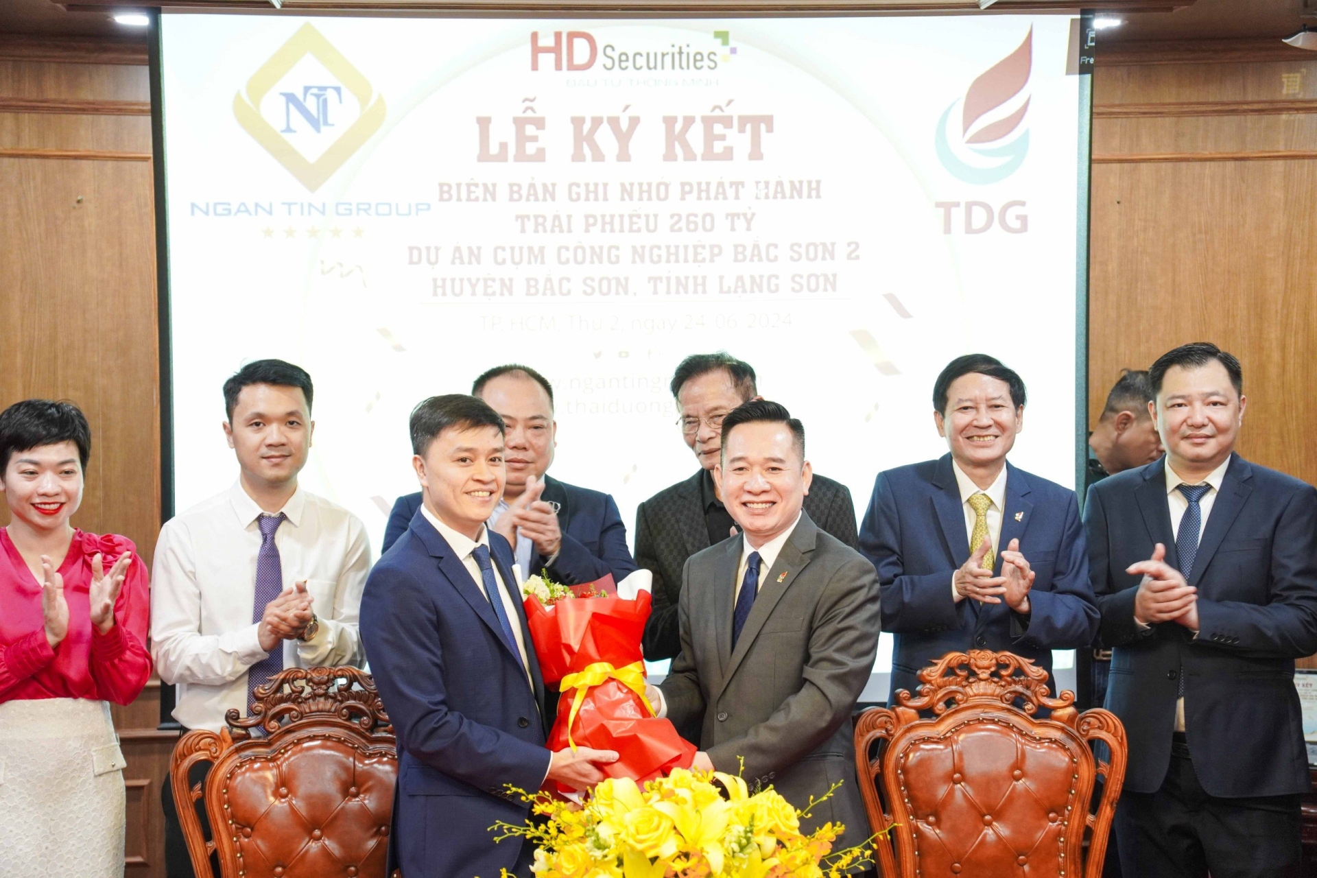 Ngày 24/6/2024, tại TP. Hồ Chí Minh, Công ty cổ phần Đầu tư TDG Global tổ chức lễ ký kết biên bản ghi nhớ thu xếp vốn phát hành trái phiếu 260 tỷ đồng cho dự án Cụm Công nghiệp Bắc Sơn 2, (huyện Bắc Sơn, tỉnh Lạng Sơn) giữa Ngân hàng HD Bank, Công ty CP Chứng khoán HD và Công ty cổ phần Đầu tư TDG Global.