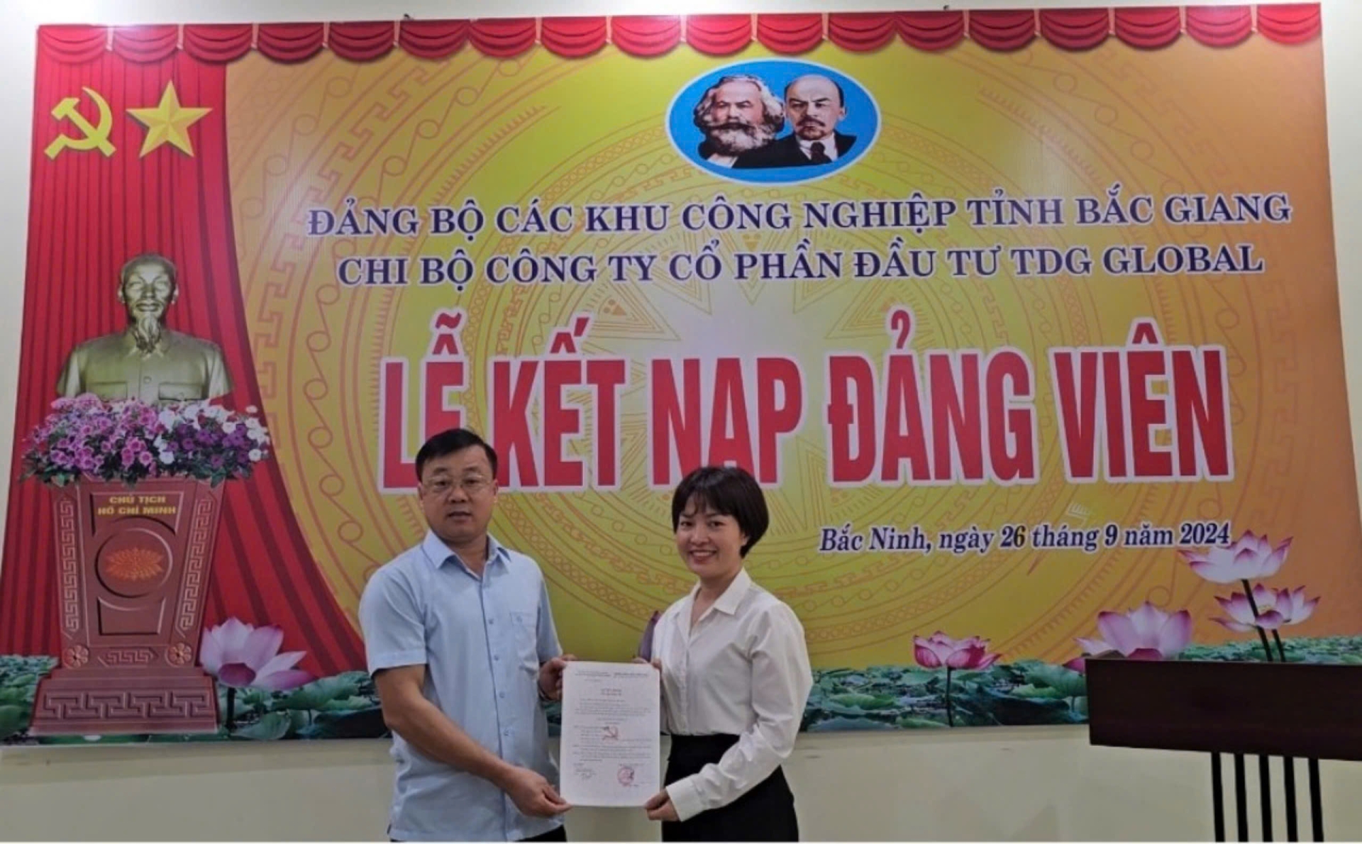 Căn cứ vào Điều lệ Đảng Cộng sản Việt Nam. Xét đơn xin vào đảng của quần chúng ưu tú Đặng Thị Lợi. Ngày 26 tháng 12 năm 2024 Chi bộ Công ty cổ phần đầu tư TDG Global đã tổ chức kết nạp cho quần chứng ưu tú Đặng Thị Lợi, nhân viên phòng kế toán của Công ty vào Đảng Cộng sản Việt Nam.